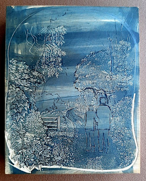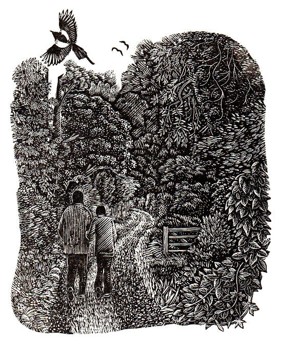 "Along The Lane" is a larger wood engraving. It shows two people walking along one of the old footpaths in the village.