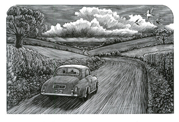 This origibal wood engraving shows an old fashioned car driving towards the sea, which is just visible in the distance. It imagines the relief felt after a long car journey when the destination is finally in sight.