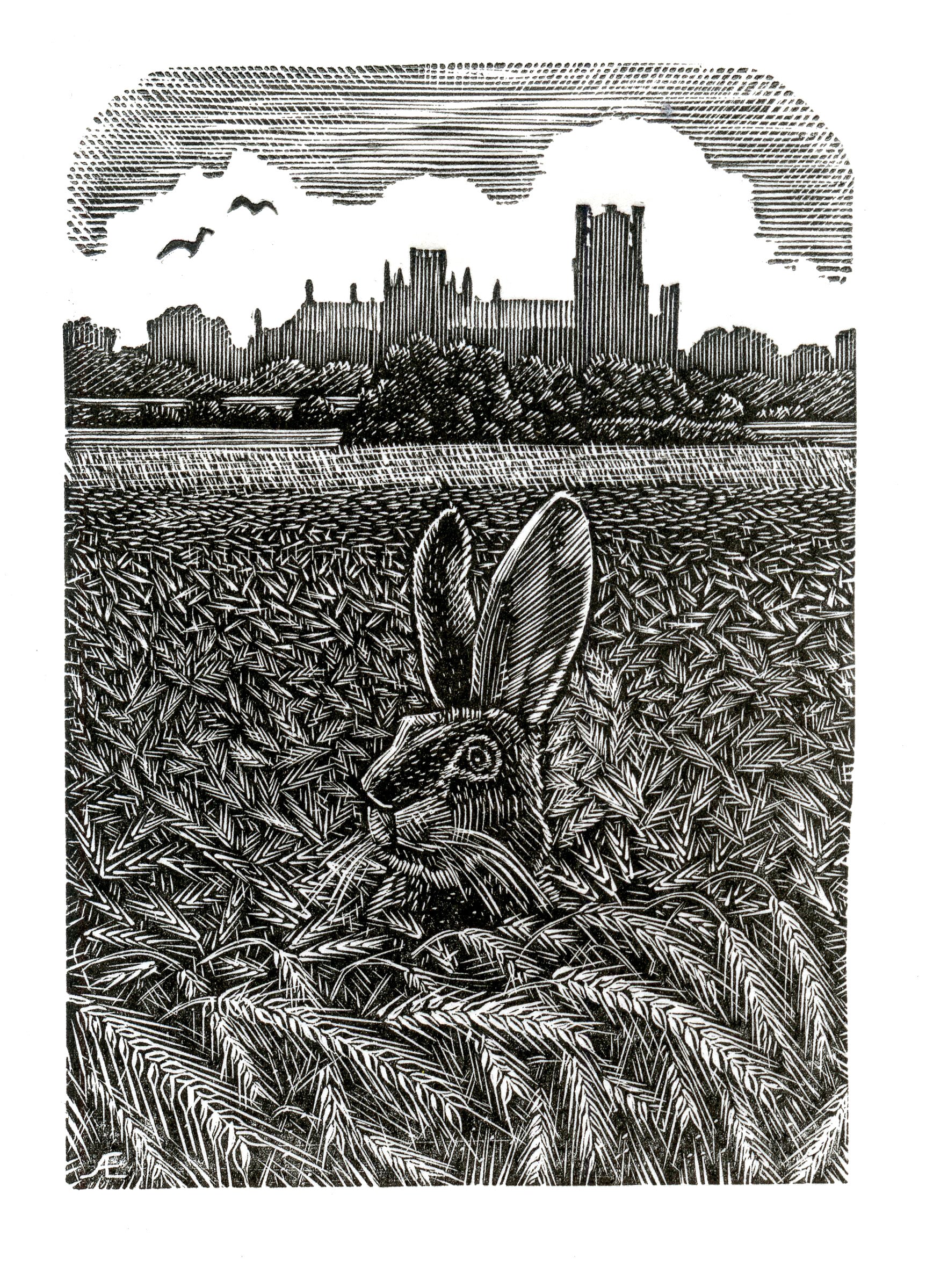 I watched this hare near to the studio during Spring. I saw him in a barley field and as the crop grew higher, I saw less of him. Finally, I saw him one day peeping out over the barley and decided to engrave him like that, with Ely cathedral in the background.