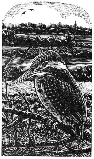 "Kingfisher Watching" is one of a pair engravings of this delightful bird.