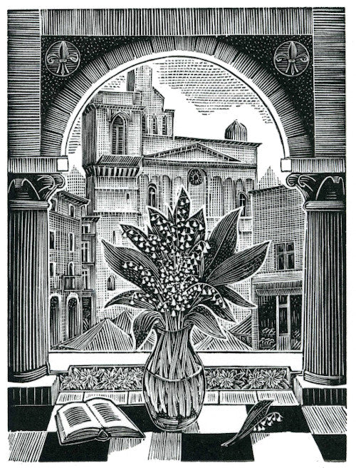 This wood engraving shows a small vase of lilies of the valley - signifying friendship - set on a windowsill in the ancient French city of Nimes. The image is 10 x 7.5cm (5 x 4inches) with clear margins around the printand has been printed from the hand engraved woodblock in an edition of 100.