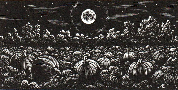 "Pumpkin Moon" is a small wood engraving. It shows a pumpkin patch illuminated by a full moon with a halo..