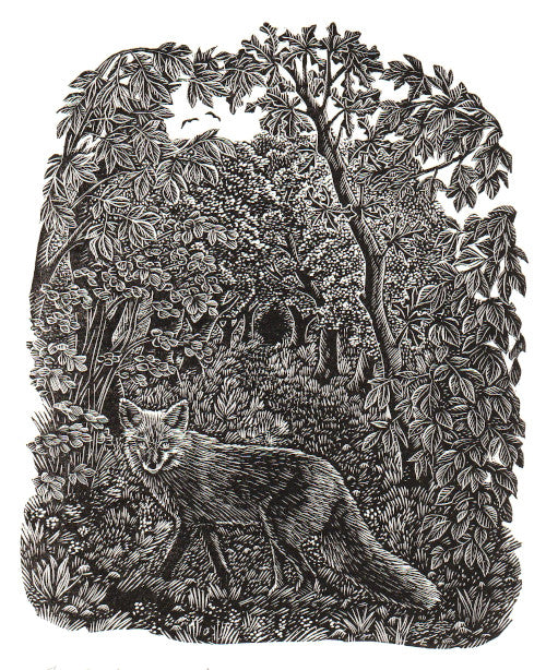 "The Fox In The Woods" is a large wood engraving. It shows a fox crossing a pathway through a wood close to the studio..
